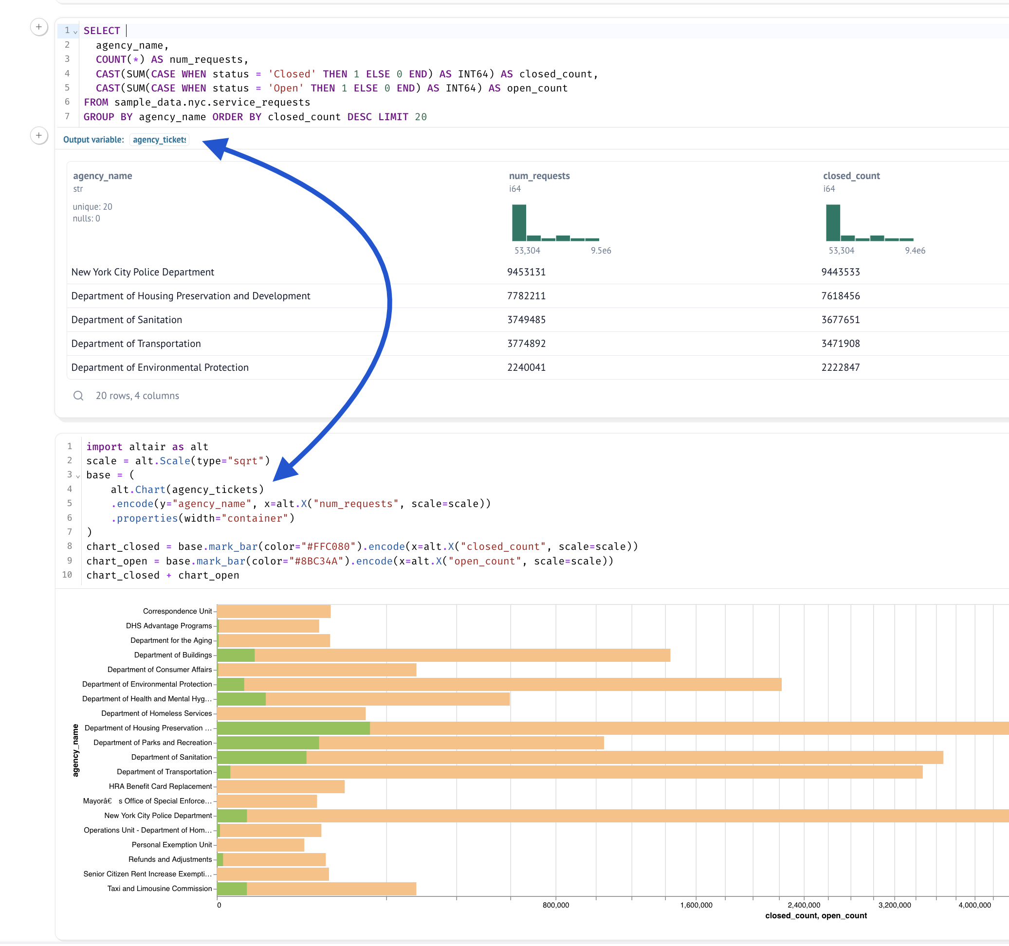 MotherDuck allows you to seamlessly mix SQL queries with Python code, enabling powerful data manipulation and analysis. Here’s an example: