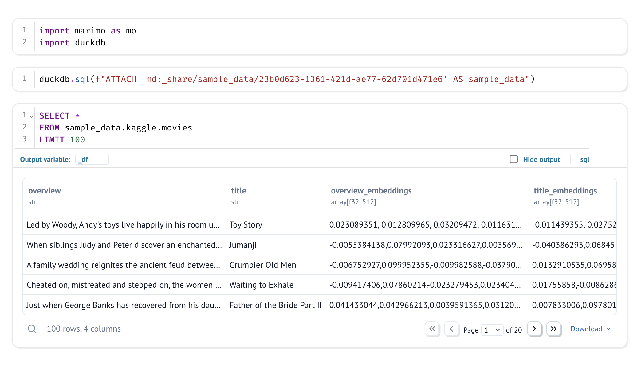 Once connected, you can query your MotherDuck tables using SQL. Here’s an example of how to query a table and display the results using marimo: